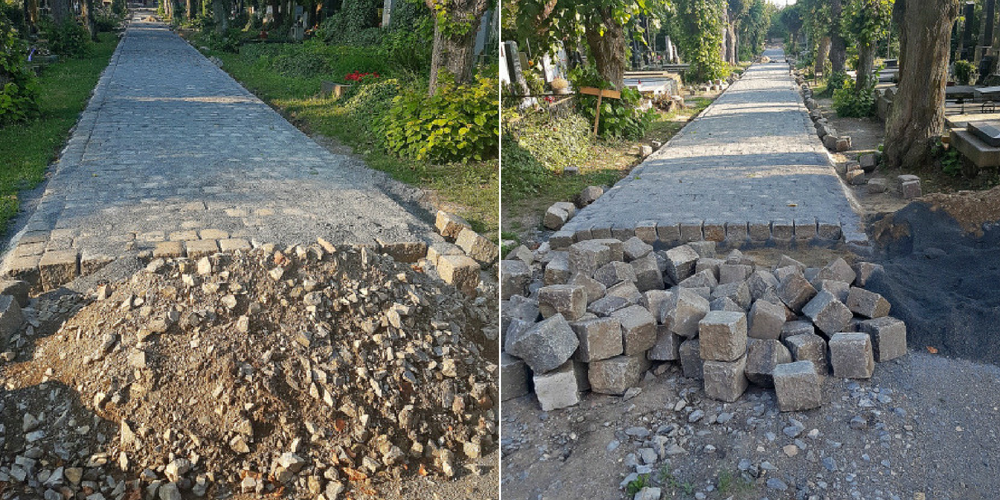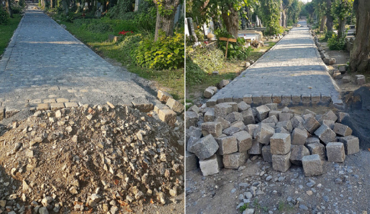 Čtyři dlouhé chodníky na hřbitově v Neředíně dostávají nový povrch. Jsou dlážděny kostkami, které v milosti tvořily cestu v ulici 1. máje.