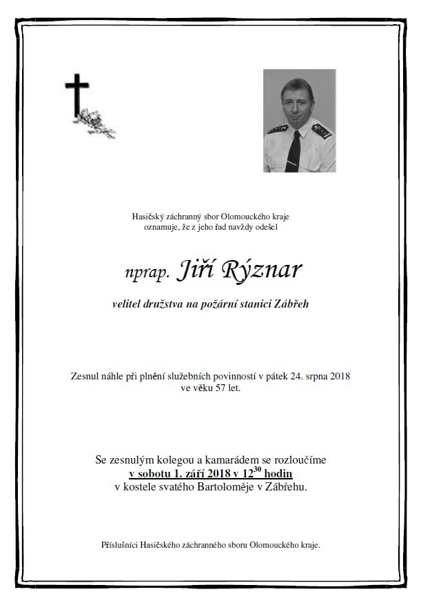 Poslední rozloučení s nadpraporčíkem Jiřím Rýznarem, který tragicky zemřel v pátek 24. srpna cestou k zásahu, proběhne v sobotu 1. září 2018 ve 12:30 v kostele svatého Bartoloměje v Zábřehu.