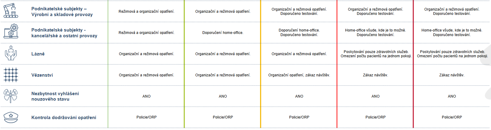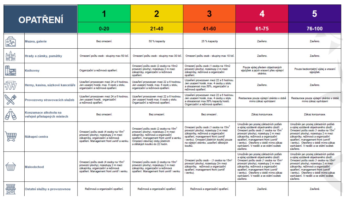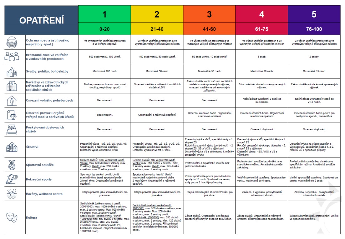 Podle skóre budou kraje řazené do pěti stupňů pohotovosti, na které budou navázaná příslušná protiepidemická opatření týkající se např. roušek, shromažďování, obchodů, kultury nebo školství.